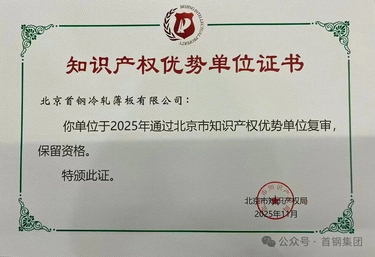 从攻克高端汽车板技术难题到赋能智能制造升级,从单项专利突破到知识产权生态构建,连续三次的荣誉加持,既是对首钢冷轧过往创新成果的肯定,更是对未来发展的期许。面向未来,首钢冷轧将继续保持持续创新的战略定力,深化知识产权战略实施,聚焦高端汽车板与绿色制造转型,以更多高价值专利支撑核心竞争力提升,为首钢高质量发展注入更强动力。